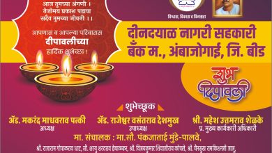 दीनदयाळ नागरी सहकारी बँक मर, अंबाजोगाई,जिल्हा. बीड तर्फे आपणास व आपल्या परिवारास दीपावलीच्या हार्दिक शुभेच्छा.